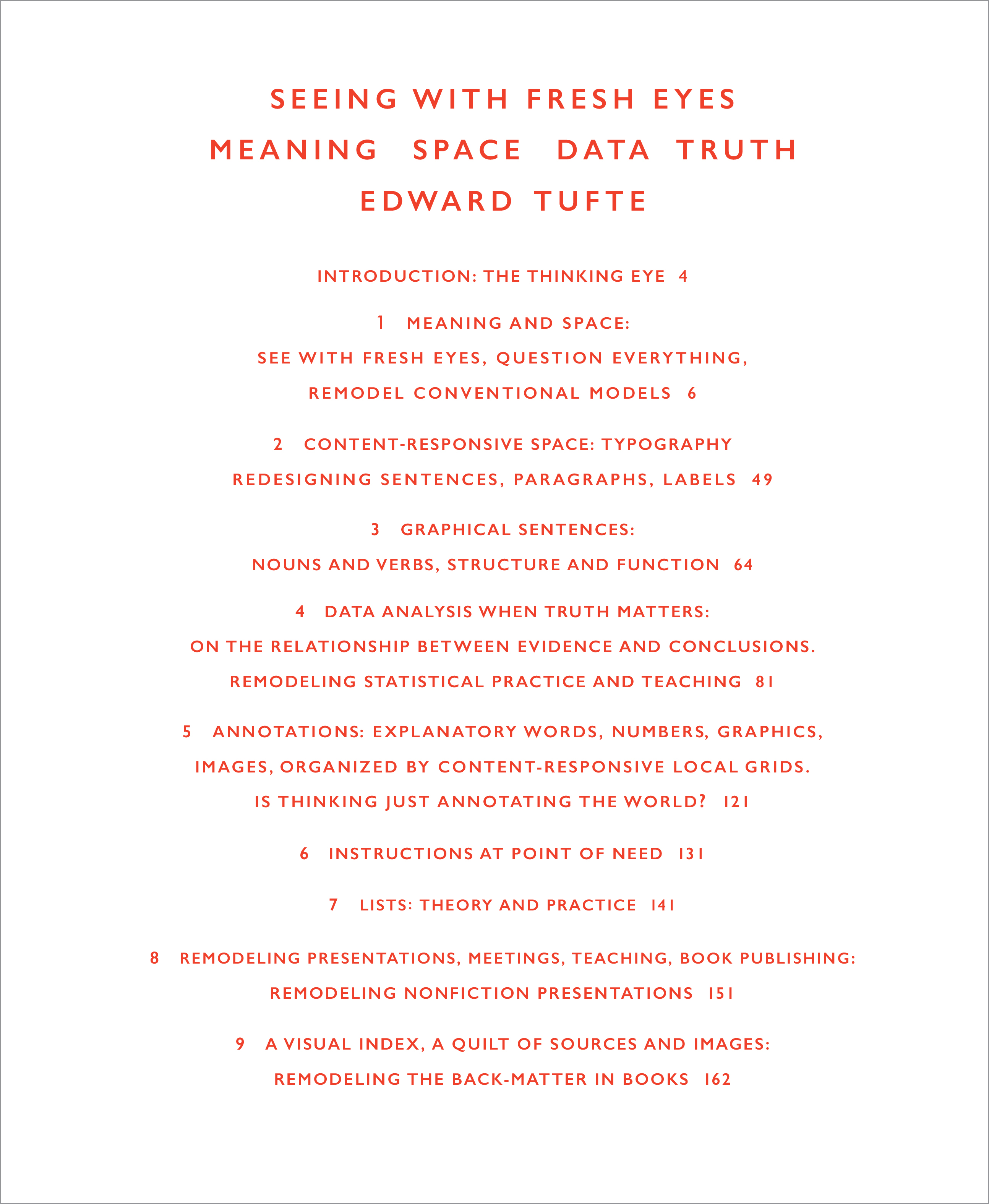 - "Edward Tufte is the revelatory retina of our time, ever connecting eye and brain in enlightening new ways. He creates masterpieces about design that are themselves masterpieces of design. Seeing with Fresh Eyes: Meaning, Space, Data, Truth takes all that he knows into a yet deeper level of wisdom and wider realm of inquiry. A completely delicious work." STEWART BRAND, WHOLE EARTH CATALOG