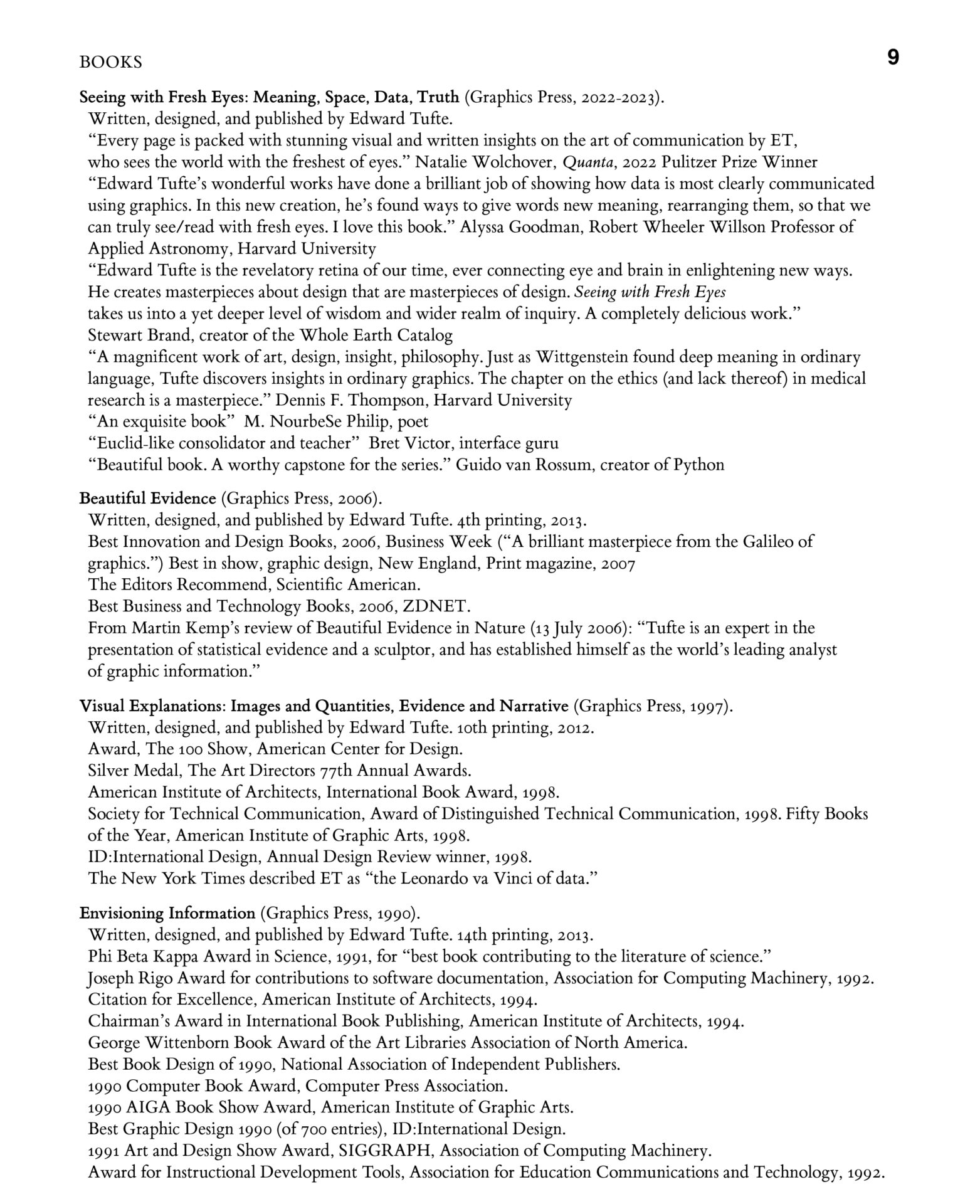 For 60 years, Edward Tufte copyrighted, wrote, designed, printed, advertised, sold 13 books and booklets on information models, data analysis, dataviz, and developed the vocabulary for data models (chartjunk, data-ink, lie factors, truth/integrity, sparklines, small multiples, imagequilts, slope graphs. . .). Sold 3 million copies, won 35 book awards, 9 honorary degrees.