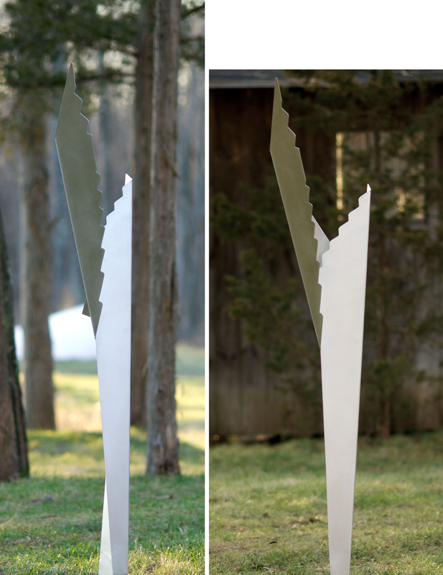 In sculpture work, reflections and shadows are often after the fact. In constructing a piece, I seek to understand the volume and edge relationships among the elements, the intersection and joinery of elements, the overall narrative and visual coherence of the piece, the activation of negative space in the air around the piece, interactions with possible contexts, and, because of the necessities of gravity and the strength of materials, mechanical-structural issues. But shadows, reflected light, and reflected light painted on another element all come for free when the piece is outdoors and the sun is shining. In designing a sculpture, it is hard to reason systematically about something that has so many faces, moving around as the sun moves through the sky and as the observer shifts position relative to the sculpture. But, if the piece is any good, then the shadows, light-bouncing, and light-painting will take care of themselves.