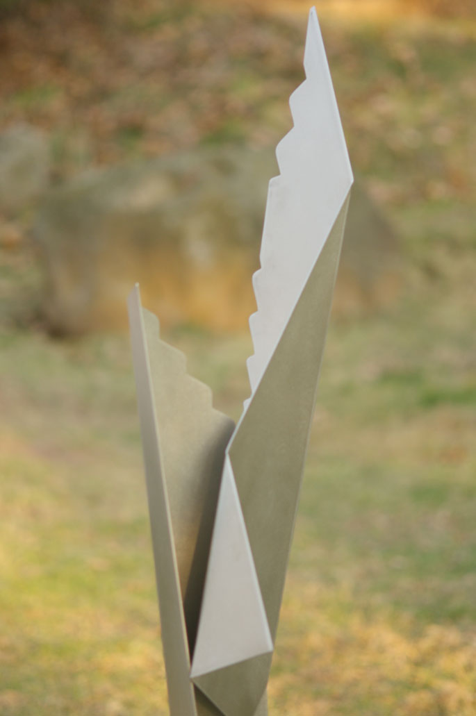 Or straight edges rather than the current Art Deco edge fluting. Or perforated metal, as in the Birds series. Bouquet in fact derives from a Bird fragment. And so on, perhaps a tour through a multivariate space of various sculptural decisions or a tour through various 3D visual effects. In this new year resolution list, I imagine a sculpture walk down a curving trail through a series of experiments (have to take into account sunny v. cloudy days, however).