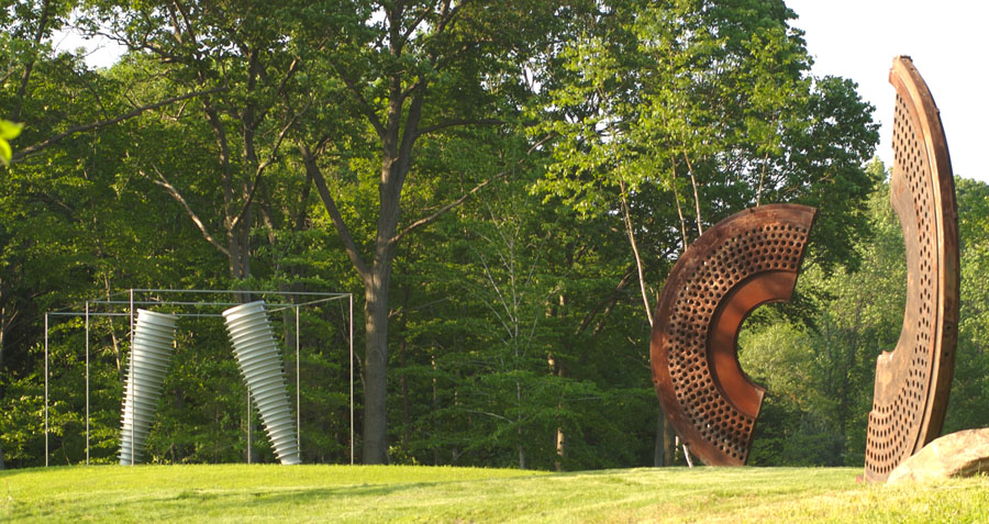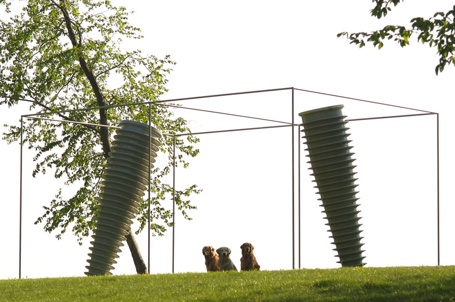 Dear Leader I was first installed last winter (thus the snow picture); the piece was completed when grass was planted earlier this spring. The grass, although a lot of work to maintain, allows all the pieces to rest on a common field and avoids a dirt patch of uninteresting and diverting visual activity localized around a piece. When kept cut to medium height, the grass also carries and expresses the land’s rolling contours and, in particular, the local horizons near the piece.