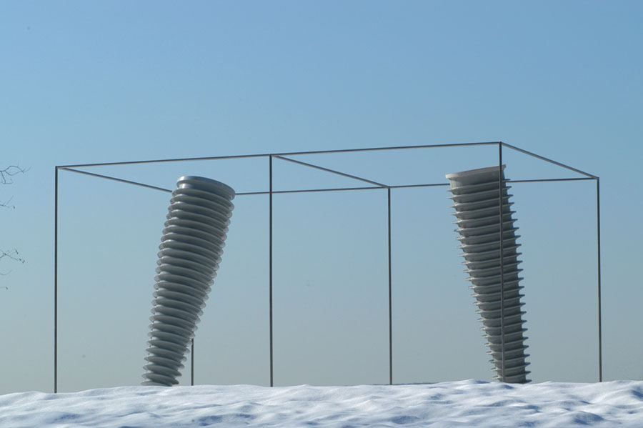 Here are photographs of a landscape sculpture Dear Leader I, stainless steel and porcelain, 21’6″ by 14′ by height 10’6″, or 6.6 by 14.3 by height 3.20 meters.