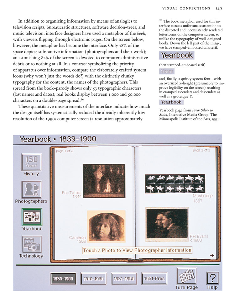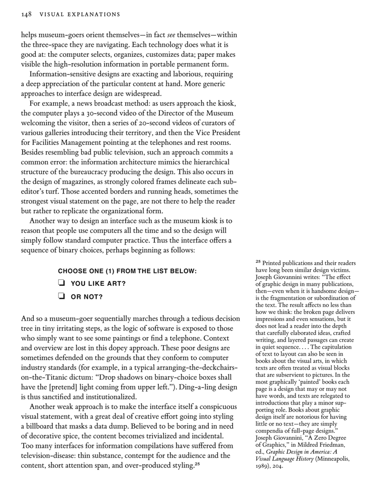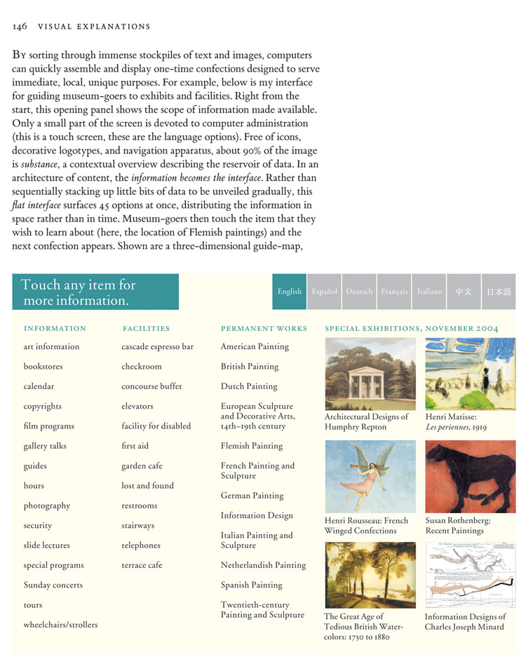 In 1994-1995 I designed (while consulting for IBM) screen mock-ups for navigating through the National Gallery via information kiosks. (The National Gallery had the good sense not to adopt the proposal.) For several years these screen designs were handouts in the one-day course in my discussion of interface design, and were then published in my book Visual Explanations (1997).