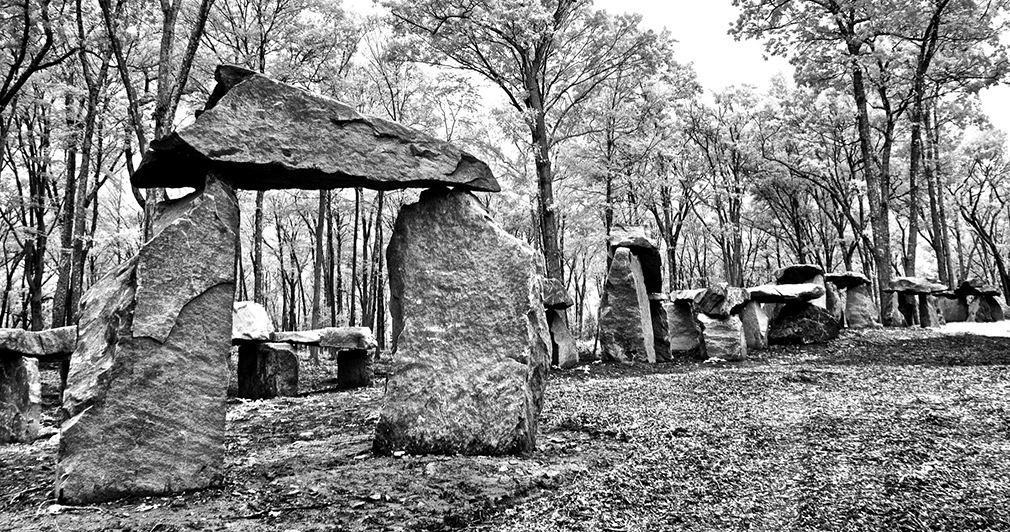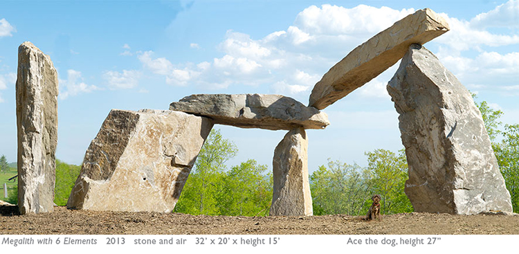 The entire artwork is devoted to contemplative seeing beyond words, and visitors are requested to remain silent when within sight of the stones. It is constructed entirely of stones found on the farm. Many of the found stones are split to reveal fresh fractured cubist arrangement. Airspaces are constructed and worked by adjusting the stones as the local configurations are created and revised.