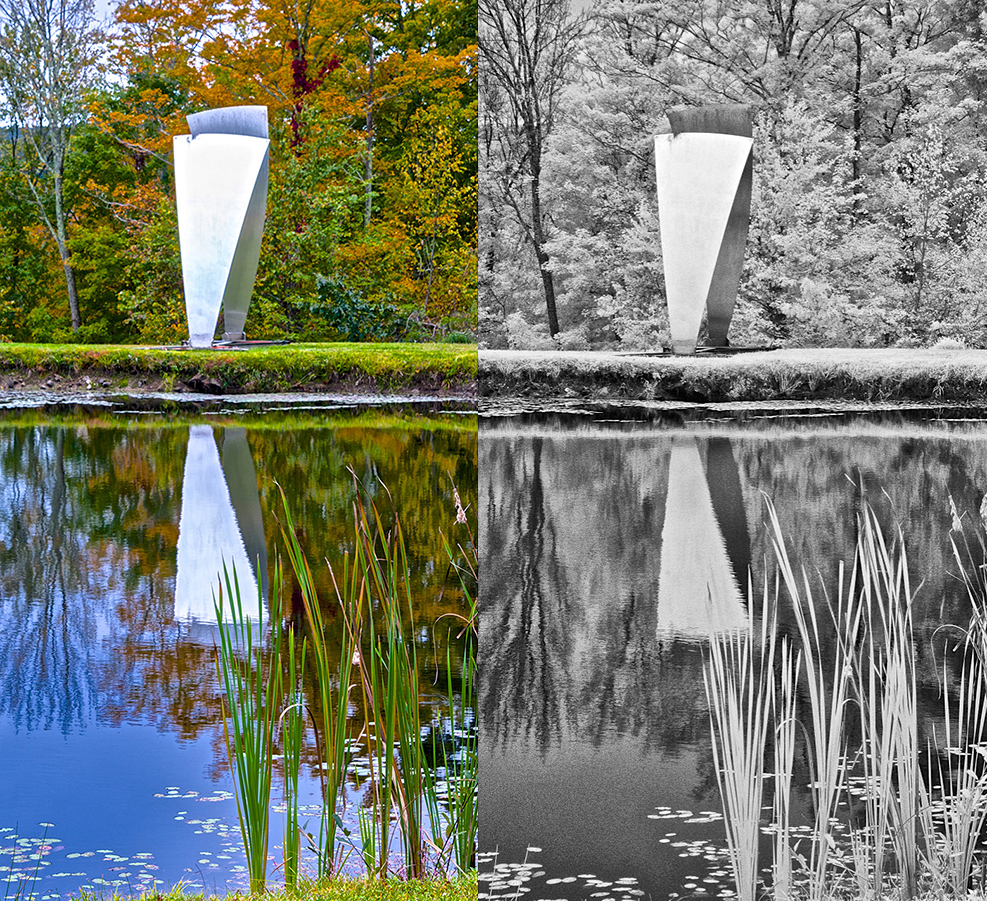 The infrared image lightens the darkness of the cool (in temperature) tree leaves, and creates an especially eerie quality to the image immediately below.