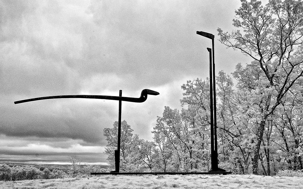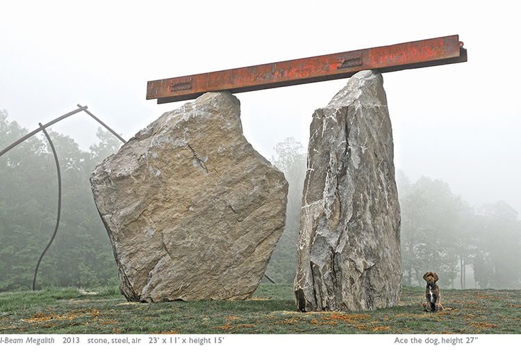 Hogpen Hill #1, first piece installed at Hogpen Hill Farms 6 years ago, stainless steel with matte (double-action grinding) finish intensely responsive to light, 24 feet tall, installation area recently revised.