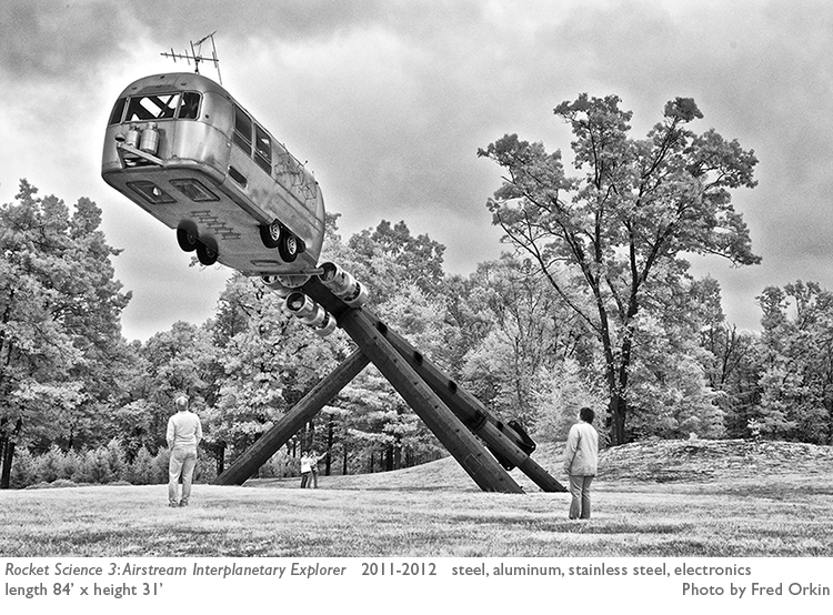 Airstream Trailer Interplanetary Explorer, with a big stainless steel Feynman diagram and a really big Tong Bird of Paradise, off toward a distant horizon.