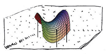 I need a 3-D image of a saddle, a hyperbolic paraboloid, the shape of which is defined by a rough scatter of data points lying on its surfaces. In turn the 3-D scatter should be projected on the 3 surrounding 2-dimensional planes making up the box around the saddle. Then the points lying in the 3 2-spaces should be projected to univariate sparklines, those sparklines folded to link the plane-pairs will also serve as the tripod axes of the 3-space.