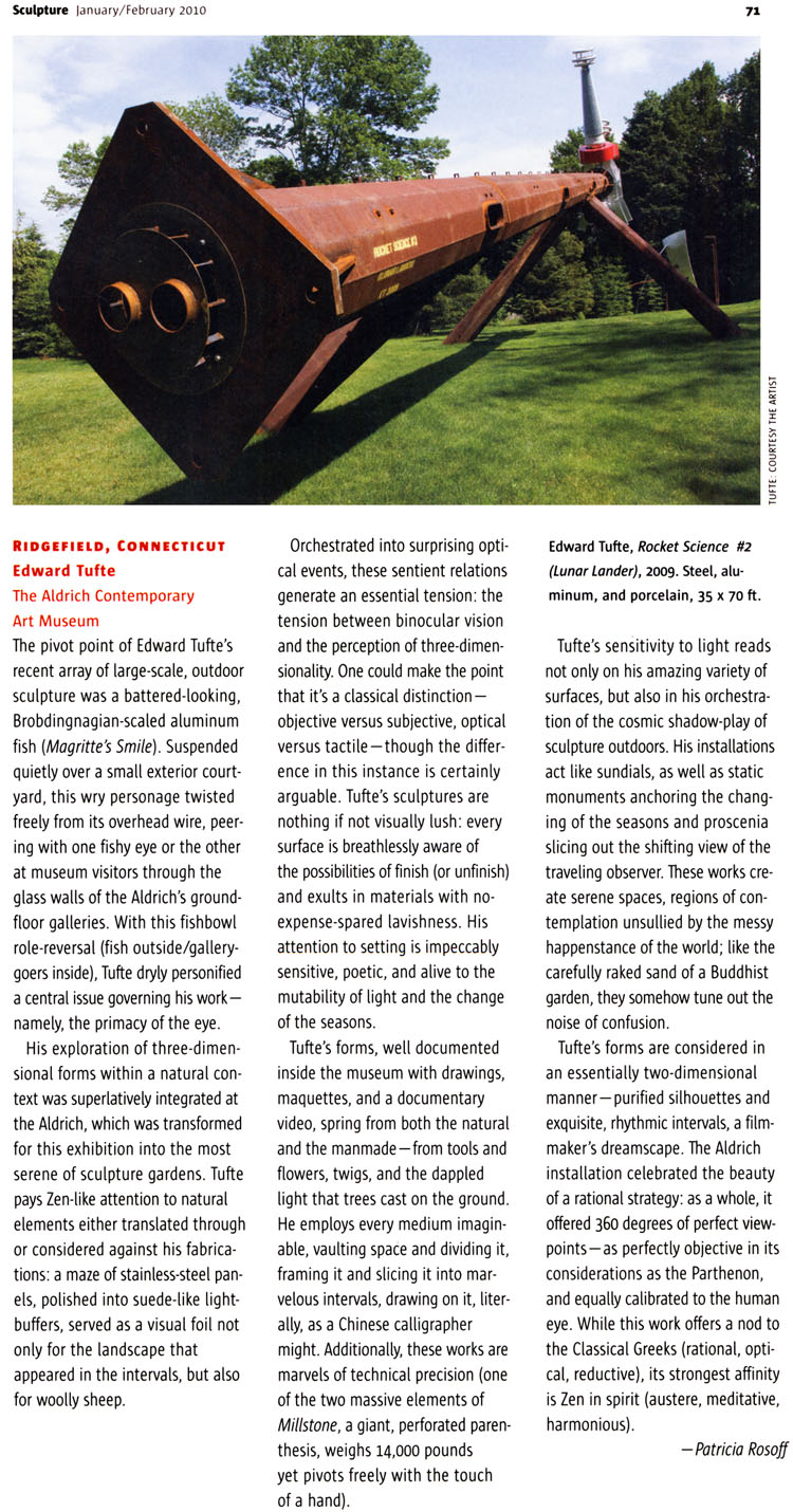 It seems to me that your sculptures illuminate one aspect of your information design that is not immediately obvious in flatland and that carries a distinct philosophical import: the object of your design, and perhaps design in general, is not the information or the sculpture, but the agent that comes into comes into contact with it (the user of the interface, the sheep in the pasture, the museum visitors). I would say that your art (and certainly your design) is decidedly effective – it seamlessly integrates with the nature and capabilities of its audience to the point of being a shadow of it. This makes me think that good design enforces a sense of identity between it and the agents that come into contact with it. Good design is a metaphor for the agents themselves.