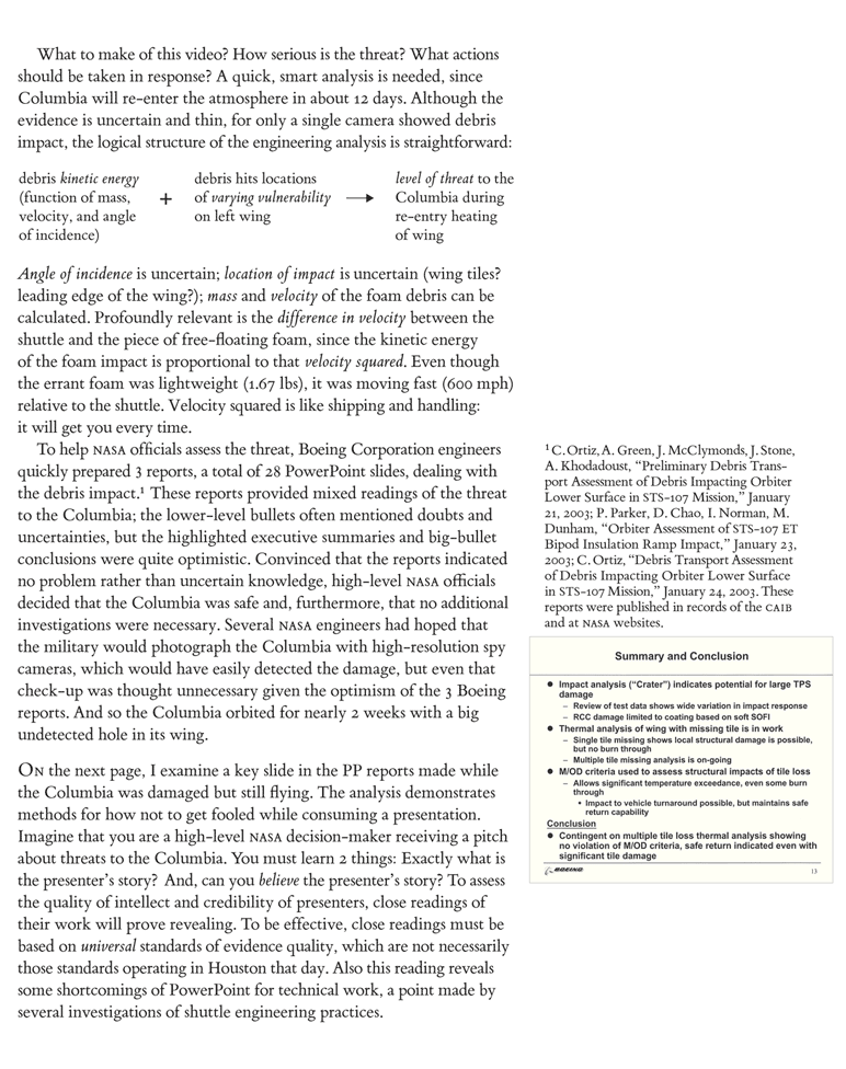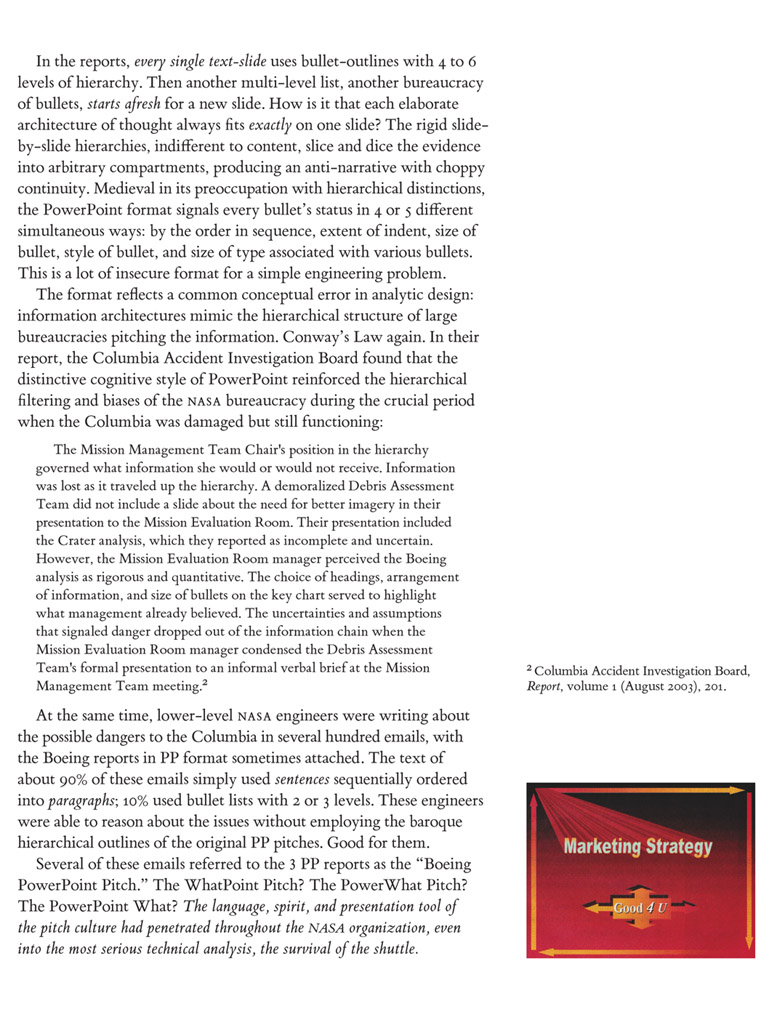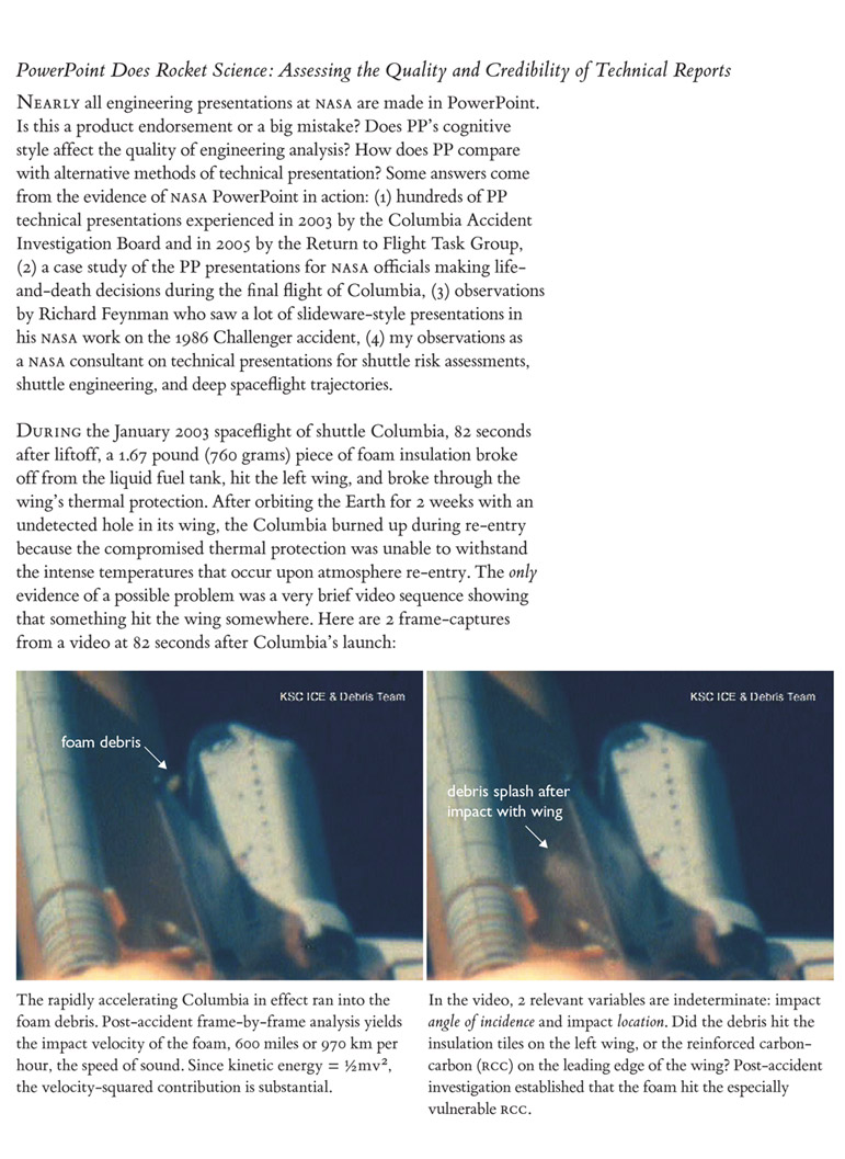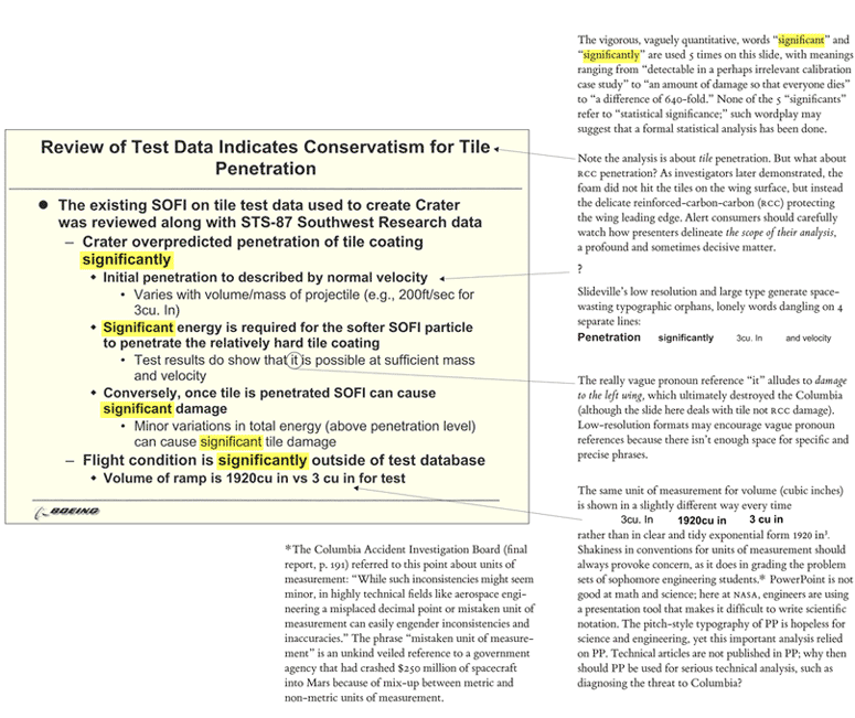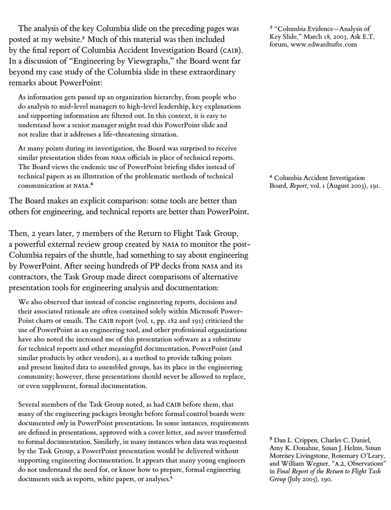 As I wrote in the essay above, “Both the Columbia Accident Accident Investigation Board (2003) and the Return to Flight Task Group (2005) were filled with smart experienced people with spectacular credentials. These review boards examined what is probably the best evidence available on PP for technical work: hundreds of PP decks from a high-IQ government agency thorough practiced in PP. Both review boards concluded that (1) PP is an inappropriate tool for engineering reports, presentations, documentation; and (2) the technical report is superior to PP. Matched up against alternative tools, PowerPoint loses.”