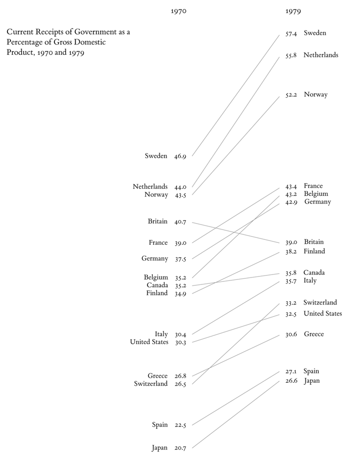 John P. Boyd in his notes on my display (with a slopegraph architecture) on decade changes in taxes/GNP for various countries suggests that the display resembles “level-crossing diagrams common in quantum chemistry and atomic physics.”