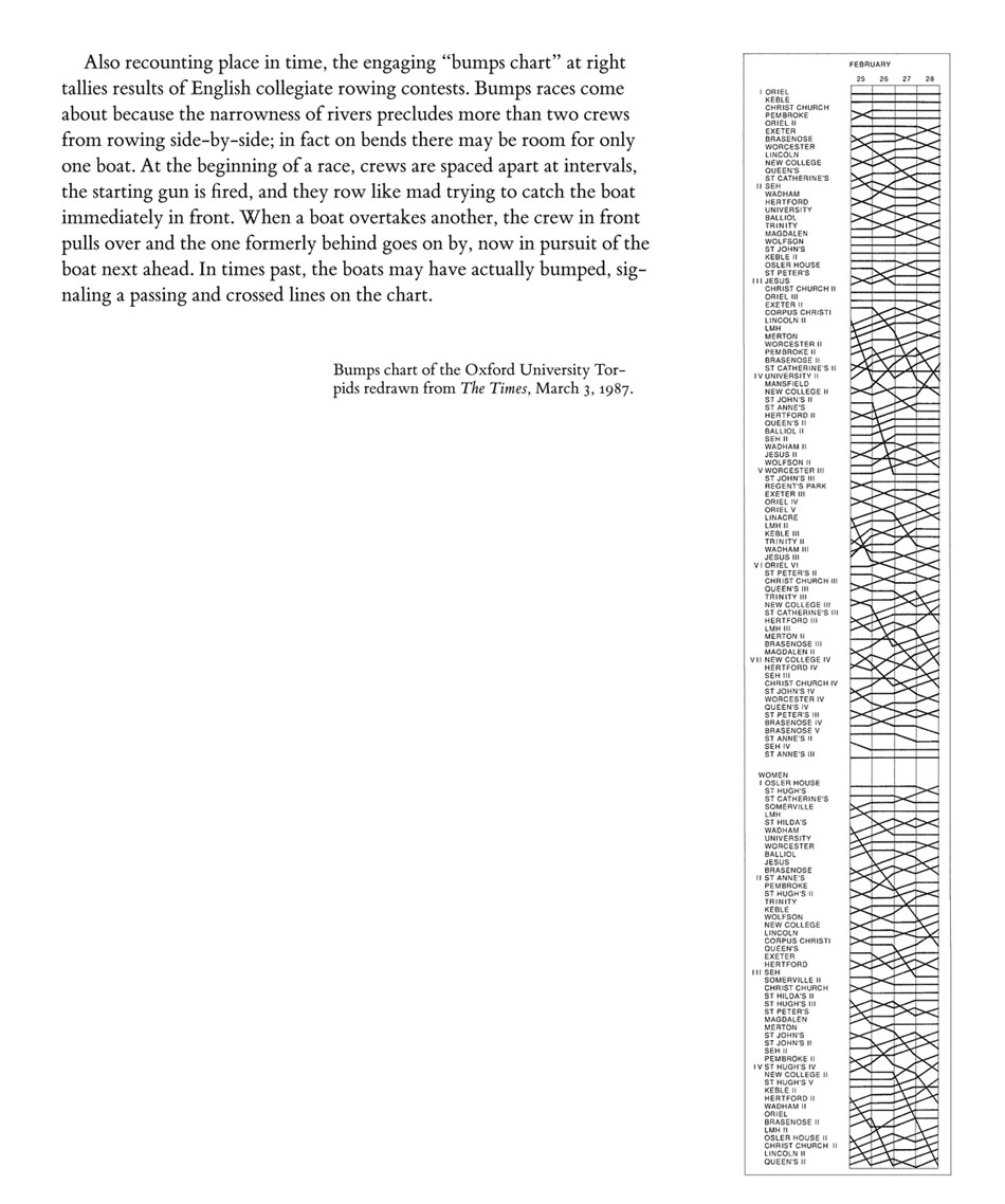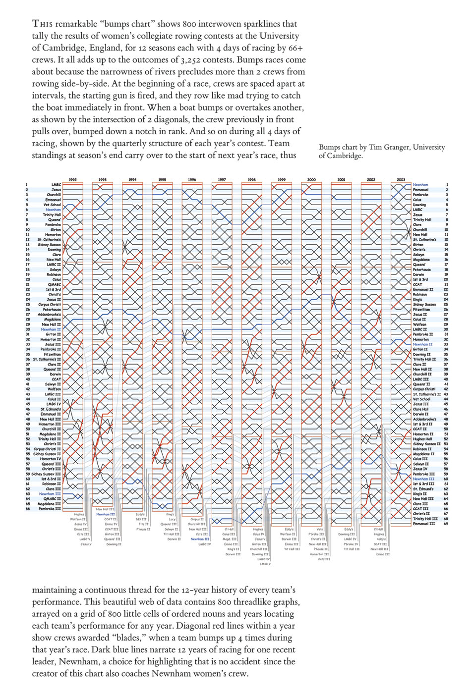 Bumps charts can also be considered slopegraphs. Here is a spectacular bumps chart from my Beautiful Evidence (2006) pages 56-57.