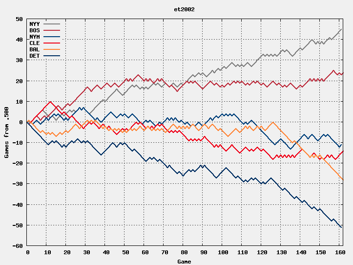 I finally had some time to make sparkish versions of a couple of my graphs for both the 2002 sample here and the 2004 AL East. Here are both: