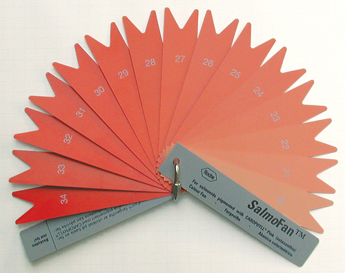 In a curious sort of information design, salmon farmers apparently choose the desired orangness-pinkness of their product from a color chart (SalmoFan) provided by Hoffmann-LaRoche which supplies the food dyes to color farmed salmon that would otherwise be gray, khaki, pale yellow, or pale pink. The SalmoFan is in tomorrow’s New York Times, “Farmed Salmon Looking Less Rosy.”